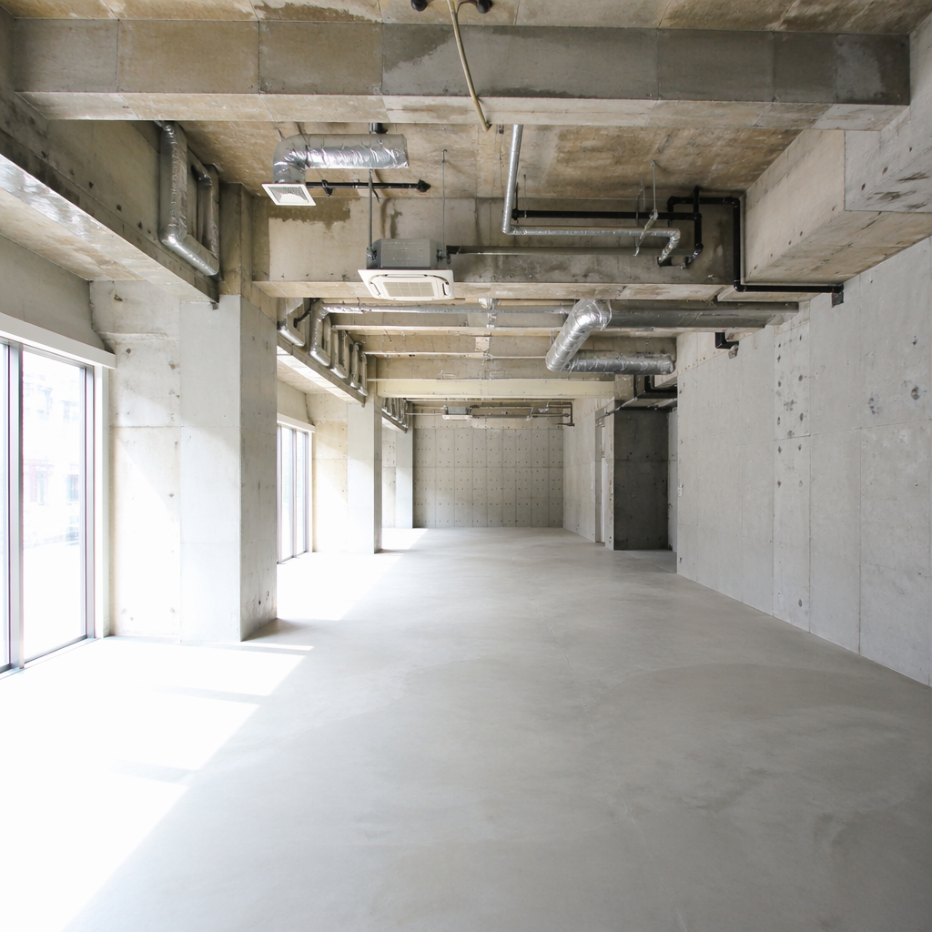 スケルトン状態とは、壁・床・天井の仕上げを全部撤去し、コンクリートの躯体だけが残る状態です。